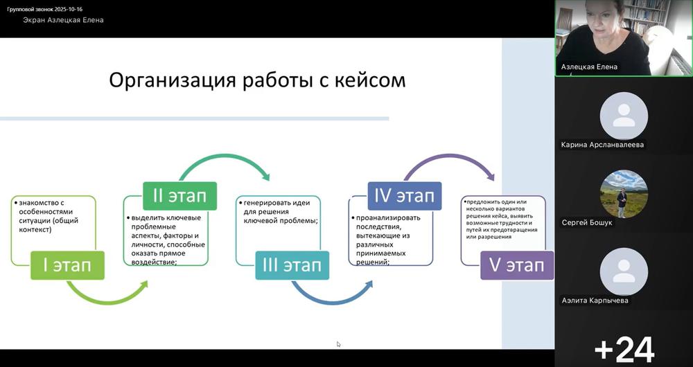 Азлецкая Елена Николаевна, доцент кафедры педагогики и психологии факультета педагогики, психологии и коммуникативистики ФГБОУ ВО «КубГУ», подробно представила участникам семинара-практикума метод кейса как фактор развития профессиональных компетенций специалиста, проанализировала организацию и этапы работы с кейсом.