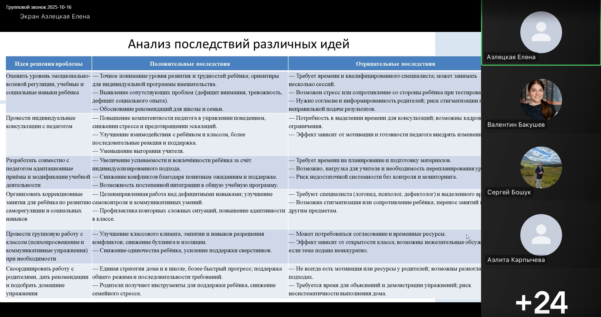 Согласно плану работы МКУ РЦ «Детство» по методической поддержке специалистов психологических и социально-педагогических служб общеобразовательных организаций МО г. Краснодар и плану работы научно-практической мастерской «Организация и сопровождение инклюзивного образования» 16 октября 2025 года на платформе Сферум проведён семинар-практикум для педагогов-психологов общеобразовательных организаций, осуществляющих психолого-педагогическое сопровождение обучающихся с ОВЗ. Участие в вебинаре приняли 32 педагога-психолога, осуществляющих психолого-педагогическое сопровождение детей с ОВЗ.
