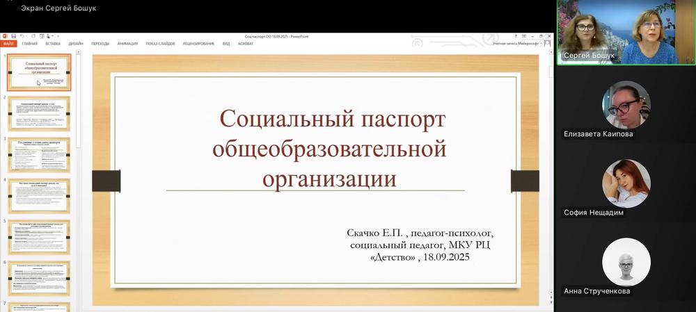 Согласно плану работы МКУ РЦ «Детство» по методическому сопровождению специалистов психологических и социально-педагогических служб общеобразовательных организаций МО г. Краснодар и плану работы «Школы начинающего социального педагога» 18 сентября 2025 года проведен семинар по теме: «Социальный паспорт общеобразовательного учреждения» для социальных педагогов общеобразовательных организаций со стажем работы до 1 года. Мероприятие организовано посредством программного обеспечения Сферум.